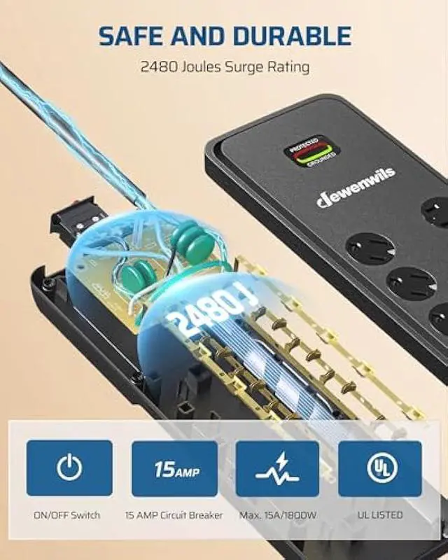 Safe & ReliableSurge protection with 2480 Joules protection rating keep devices from surges, lightning strikes, or AC contamination; Green led light indicates your devices are properly grounded for additional safety