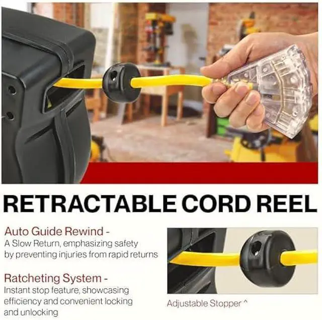 UNIQUE FEATURES - This reel utilizes a NEMA 5-15R/NEMA 5-15P 3-prong plug, Lightup Tap and includes a 60 inch Lead-in Cord; Adjustable Cable Stopper and 2 Non Snag Rollers to reduce cord abrasion; Circut Breaker included to protect reel and operator