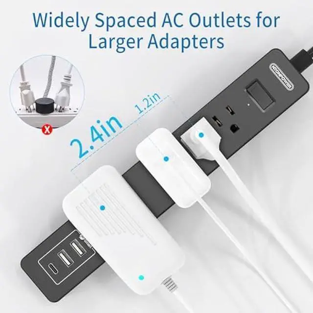 MULTI OUTLETS and SMART USB PORTS The power strip comes with 4 outlets an additional 3 USB charging ports (up to 5V/12W max output), giving you the option to plug in multiple devices or appliances thus having the same extension to 5 devices at once. 2 smart identification USB ports can auto-detect and self-adjust current to charge USB devices, speed up to 2.4A per port.