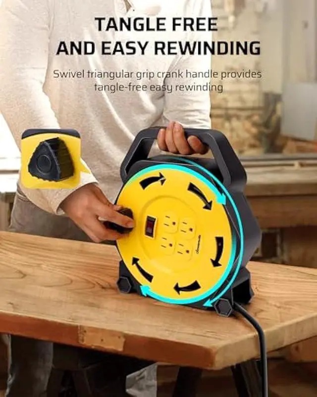 Easily Wind and Unwind Extension cord winder features a swivel triangular grip crank handle for tangle free, easy winding; helps to wind the power cord easily into electric cord reel and keep the cords neat and tidy for next use