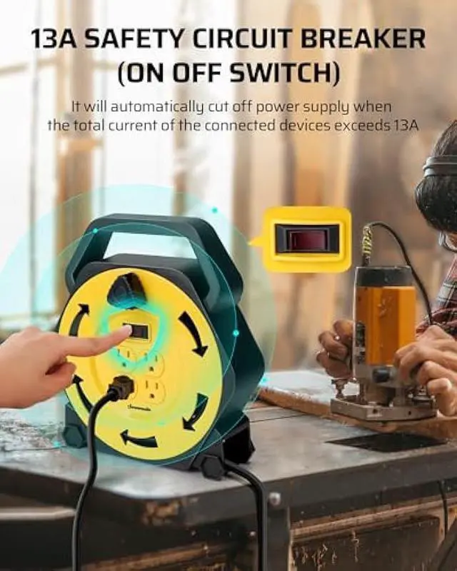 4 Built-in Grounded Outlets Rated for 13 amps, 125 volts, and 1625 watts, the heavy duty electrical cord reel power station has 4 integrated 3 prong outlets and allows you to power multiple tools at once