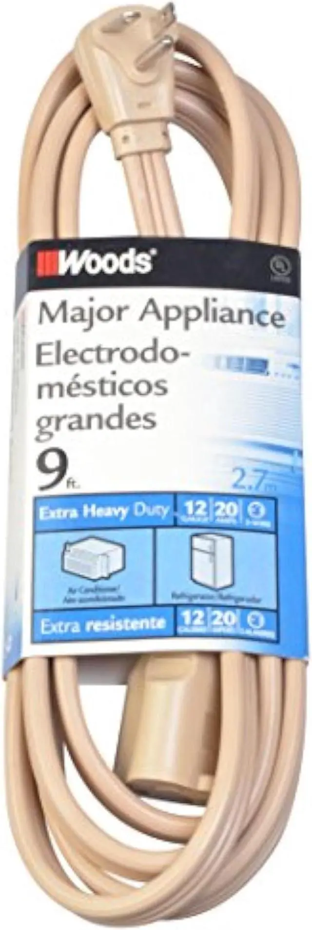 Woods Major Appliance Extension Cord - 12/3 Gauge SPT-3 - Right Angle Plug for Tight Spaces - Compatible with 250V 20A Appliances - Designed for Major Home Use - Beige Cord - 9 Feet