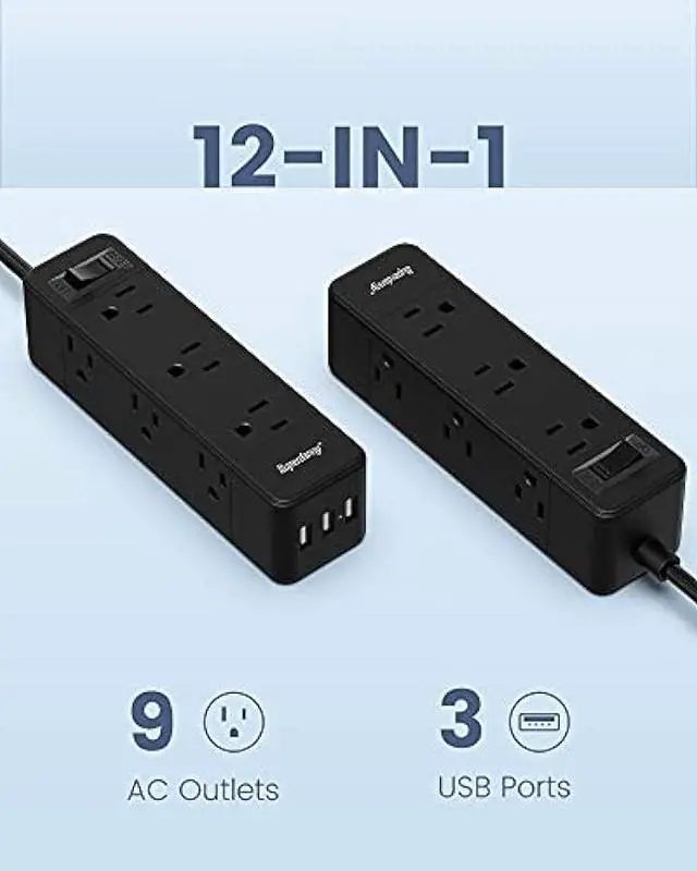 12 IN 1 Charging Station with USB 3-Side power strip with 9 AC outlets and 3 USB slots can power up 12 devices simultaneously. With 1050J Surge Protection, this electric power surge protector is perfect for surround sound system, TV, phone, tablet, PC, laptop, gaming computers, lamps, and other devices, which can safeguard your electronic devices from harmful power surges and spikes.