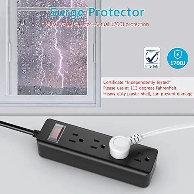 • Exterior power strip surge protector, 1500J surge protector will protect your equipment, sturdy enough for daily use, AC Output: 12A/110-220V/1500W. Please make sure that rainwater can flow out when in the rain for a long time.
