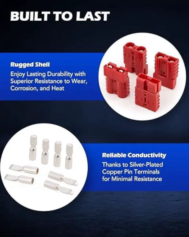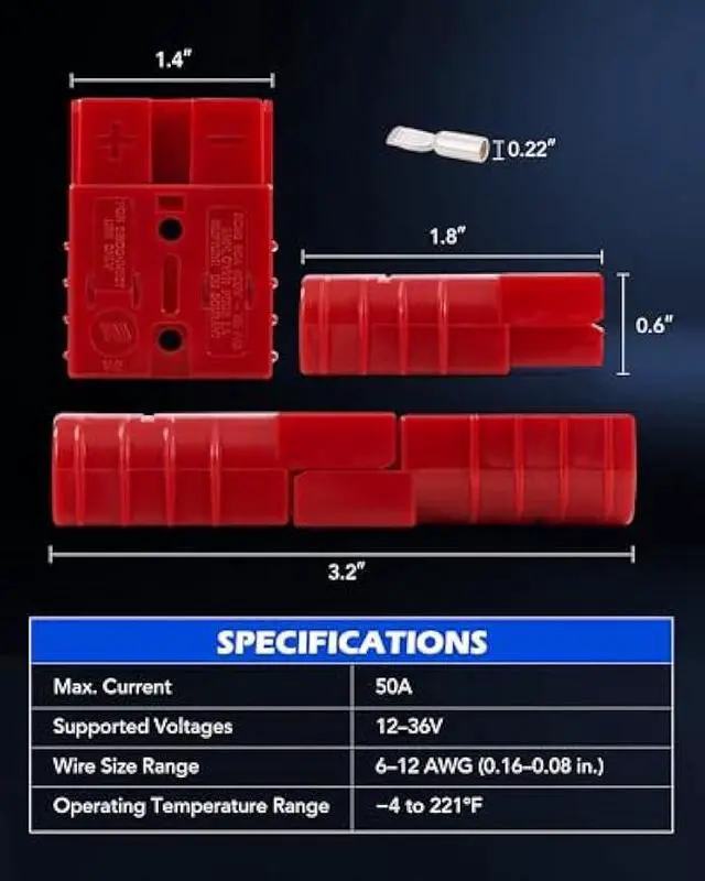 WIRE CONNECTOR PACK: This handy electrical wire connection set from OMT includes 4 clearly marked plugs that let you patch and disconnect 6 to 12 gauge ( 0.08 - 0.16 ) wire pathways from 12V, 24V, or 36V batteries, supporting currents up to 50 amps