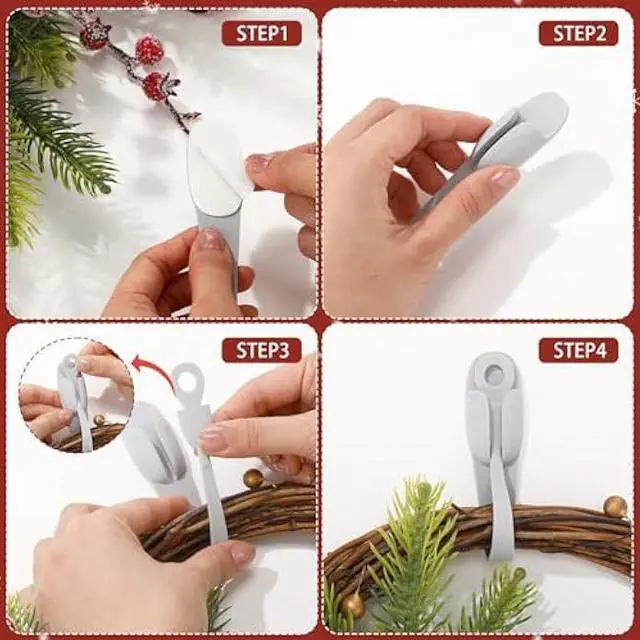 How to Use: 1; These Christmas wreath hooks feature a buckle and self-adhesive design, making them easy to attach to most locations; After the season is over, these cord holders can be easily removed; 2; Tear off the adhesive film and stick a cord holders in its pre-cleaned position (for best results, leave it standing for 24 hours); Then, place the sorted power cord into the buckle for a convenient and quick operation