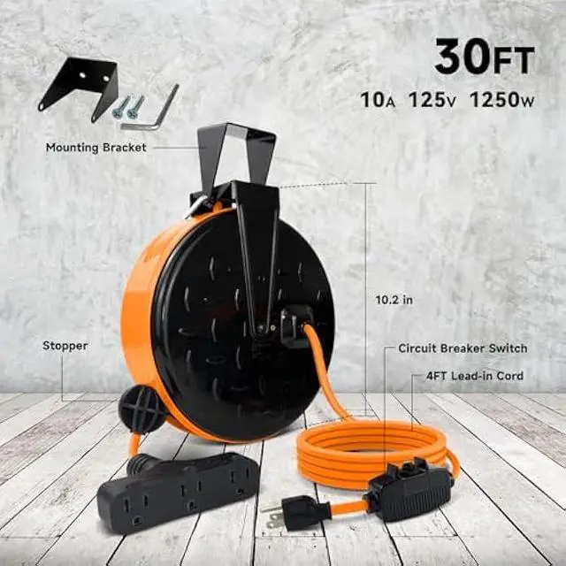 30 Ft 16/3C Gauge Power Cord - The length of the extension cord reel is 30ft. It can support up to three devices working at the same time and is more durable. Maximum power rating is 125V/1250W/60HZ.