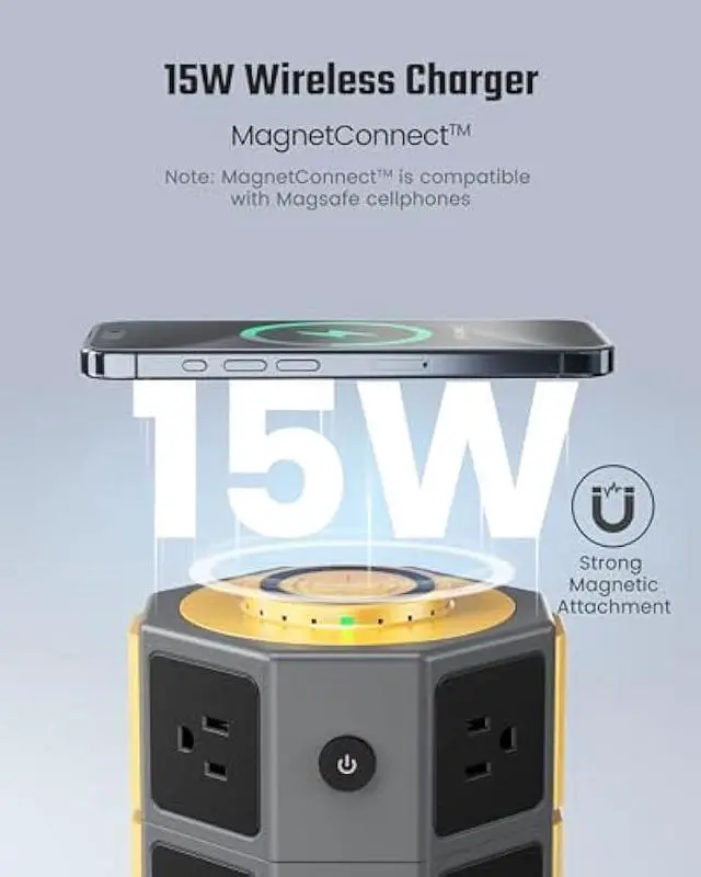 Magnet Connecting Wireless ChargerThanks to the 15W Magnet Connecting wireless charger on top, you can simply place your cellphone on the charger and it will be automatically aligned by magnet and stay firmly on the charger to be charged (compatibility with magnet alignment feature is required for the cellphone. )