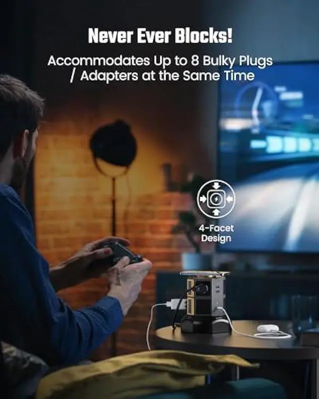 USB C Power StripThe power strip with USB C ports features 8 AC outlets, 2 USB-A ports ( 2.4A Max), and 2 USB-C ports (3A Max). All of these ports are arranged vertically on four sides, making it ideal for accommodating bulky plugs or adapters and facilitating multiple uses simultaneously. Additionally, equipped with smart IC technology, the USB ports are able to detect your devices and automatically provide the fastest yet safest charging current within the output capability available.