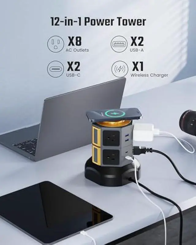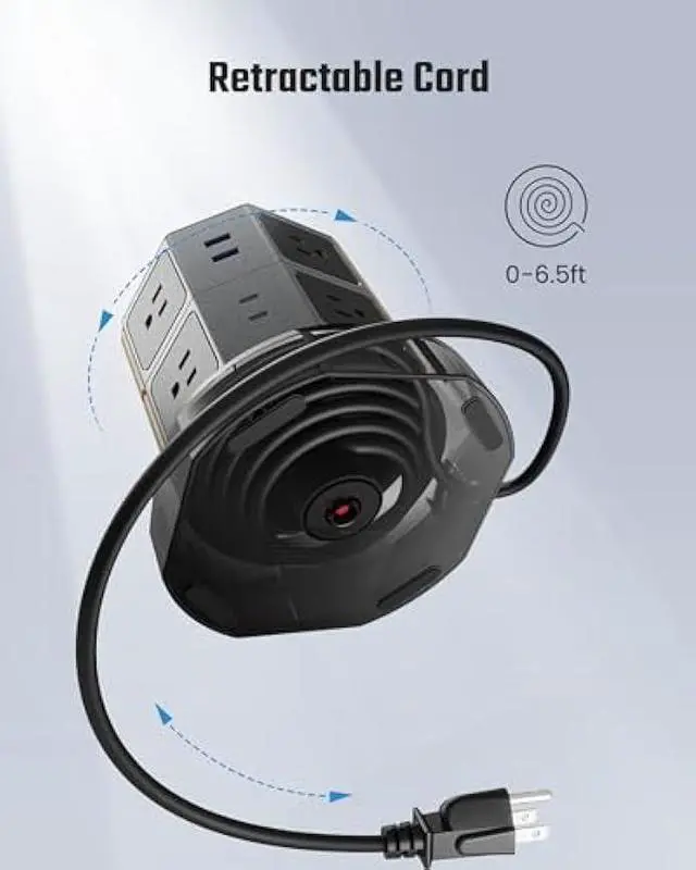 Space Saving and RetractableThe small footprint power tower manages its 6.5 ft power cord by rolling the main body, combined with vertical tower design with a small footprint base to offer you a self-adjusting reach to the wall outlet but covers zero extra space, keeping your desk clean and tidy.