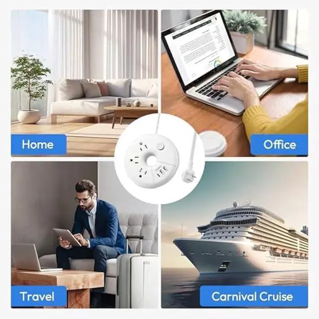 Full-Round Protections The cruise power strip white with USB outlets is FCC & RoHS approved with high temp fireshield outer shell. Round power strip ensures complete protection against electrical short circuit, over heat, over charging, over current and over voltage. Protect your home&travel with travel power strip USB.