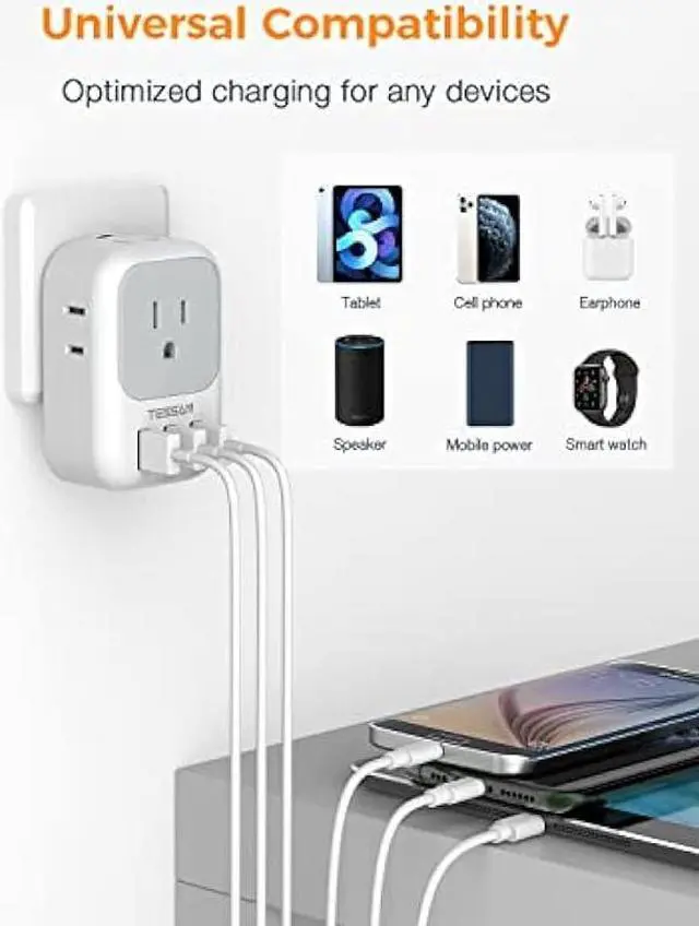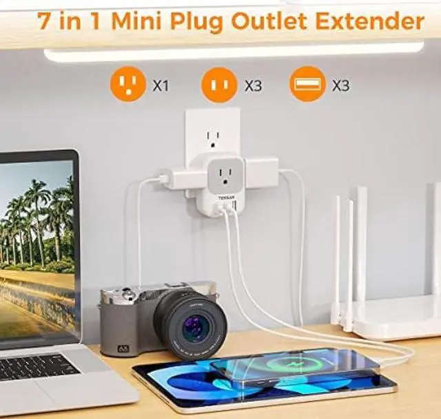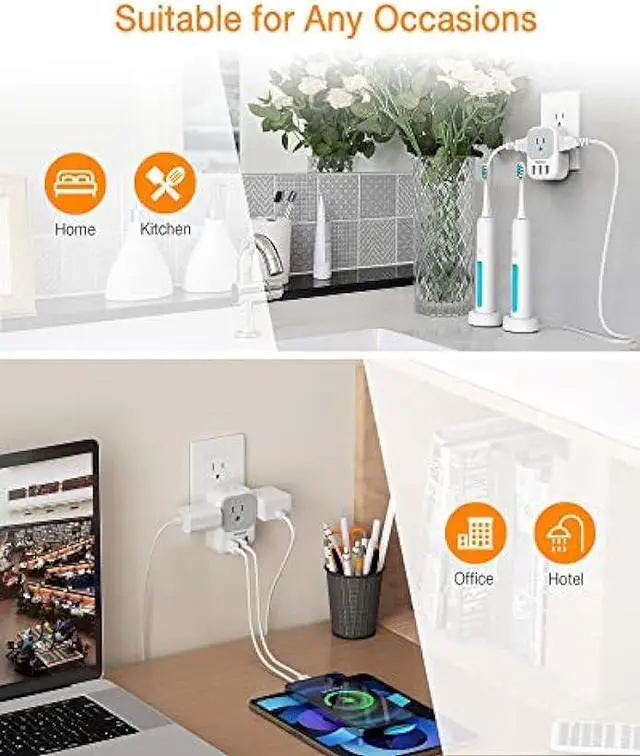 7 in 1 Wall Outlet Splitter: This multiplug electrical outlet extender box could turn 1 socket into 4 AC outlets and 3 USB ports, accept the standard N American 2 or 3 prong flat pin plug, can charge 7 devices simultaneously; You can use it in any indoor place such as home, office and dorm room