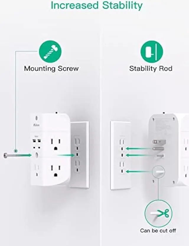 Double Stability & Wide SpaceThe screw included can be used to secure it on duplex outlet. The plastic prong at the back is for stable purposes also. For USB receptacle and GFCI outlet, the plastic prong needs to be cut off before use. 3-sided design and 1.7 inches large space between 5 sockets make it easier to use for all kinds of equipment even oversized power adapters.