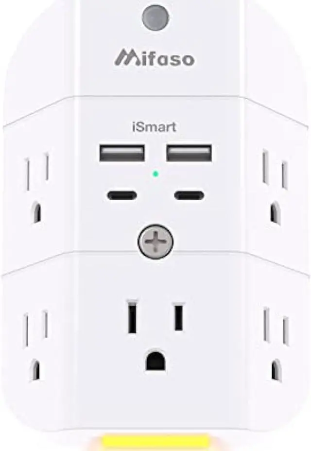 9-IN-1 Wall Outlet Extender - 5 AC outlet extender (3 sides, 125V, 15A, 1875W) with 2 USB-A and 2 USB-C charging ports, 1080 joules surge protector, LED night light on the bottom. The screw included can be used to secure it on duplex outlet. Connect your devices conveniently with the multiple outlet plug.