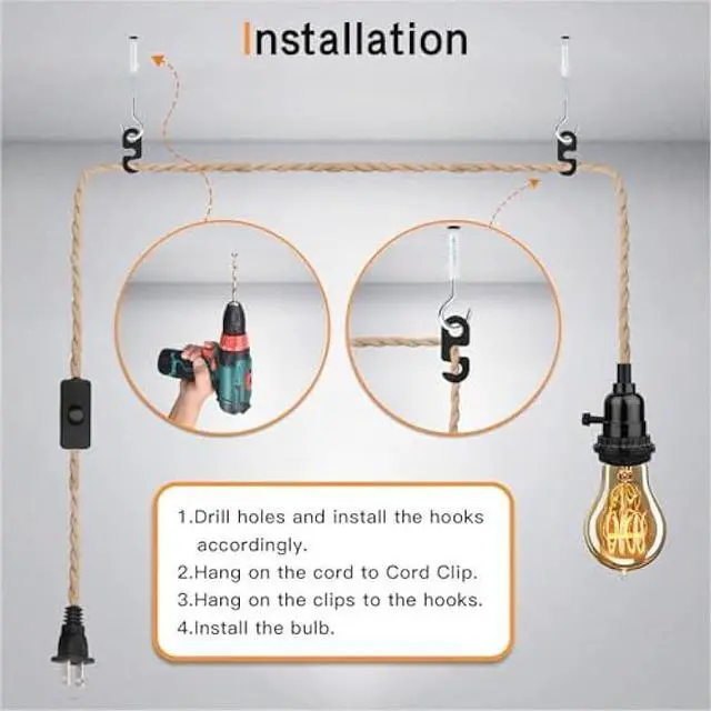 Thoughtful Design: Besides the inline switch on the swag light cord, the light socket also has its rotary toggle on/off switch. It can solve the problem that the electrical outlets is too low or too high to turn off the light. With 2 ceiling hooks and 2 cord hooks, installation is very simple, no electrician and wiring is required, and can be hung from the ceiling according to your needs.