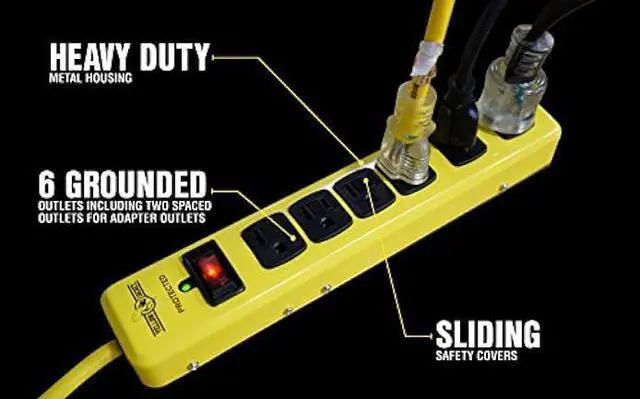 Heavy duty metal housing makes this 6 outlet surge protector perfect for use in your workshop or any other rugged work area