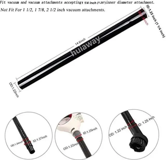 The vacuum extension wand fits many vacuum and vacuum attachments accepting 1 1/4 inch ( 1.25 ) (32mm) inner diameter attachment. Not Fit For 1 1/2, 1 7/8, 2 1/2 inch inner diameter, please measure your diameter of your vacuum hose or wand before purchase for a perfect fit.