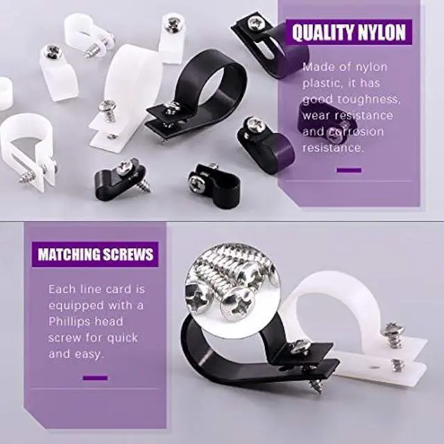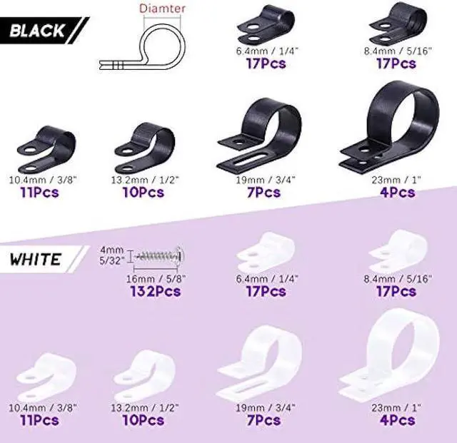 Equipped With Screws --- In This Kit, You will get Swpeet 135 Pack 6 Sizes Nylon Plastic R-Type Cable Clamp Clips Assortment Kit, 6.4 mm(1/4''), 8.4 mm(5/16''), 10.4 mm(3/8''), 13.2 mm(1/2''), 19mm(3/4''), 23mm(1'') Nylon Clips with 135 Pack Screws for Wire Management.