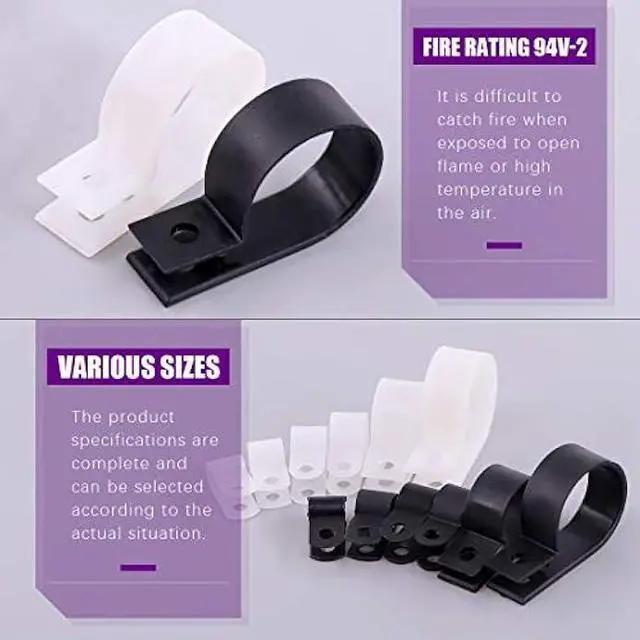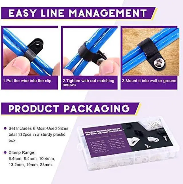 Diverse size--- Suitable for most common size wiresThere are six types of wire selectable sizes 6.4 mm(1/4''), 8.4 mm(5/16''), 10.4 mm(3/8''), 13.2 mm(1/2''), 19mm(3/4''), 23mm(1''). A total of 135 clips.