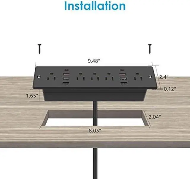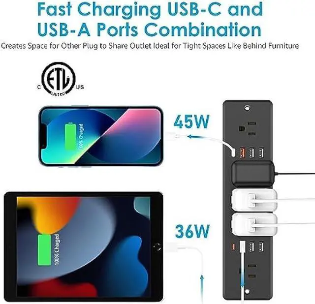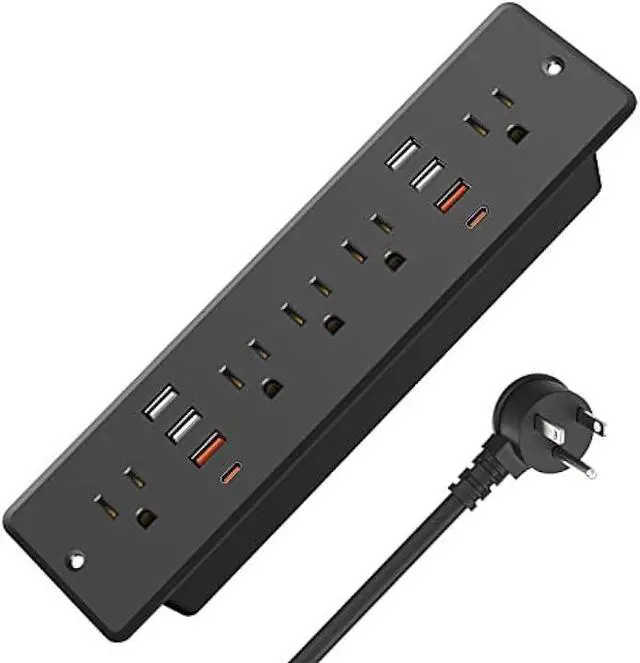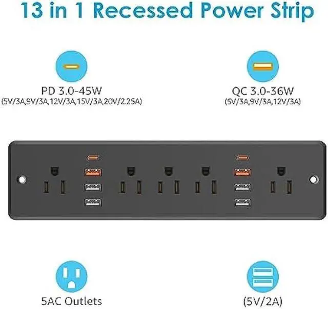 Fast Charging Recessed Power Strip: 5 Outlets Output rating 10 Amp / 125 Volt / 1250W. Come with fast charging QC 3.0 36W Max USB-A port and PD 3.0 45W Max USB-C port and four normal smart USB ports. It can quickly charge your multiple smart devices, facilitate your life and save you time.