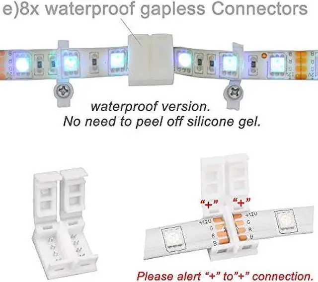 WATERPROOF DESIGN -Includes 5 types of waterproof connectors. NO need to peel off silicon on the surface around soldering area. Simply slot the strip light into connector and clamp the cover. Perfect for waterproof LED tape DIY project. (Normal L shape and T shape equipped ones and wire connector are non-waterproof version but common for waterproof lights strips' peeling use)