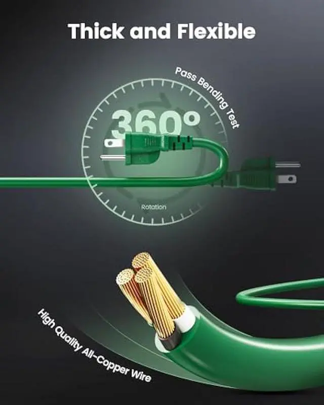 Green Extension Cord Blends with Outdoors: Green color blends seamlessly with outdoor foliage; ideal for holiday decorations and landscape lighting; integrates smoothly into seasonal displays, enhancing the convenience of setting up Christmas lights and other outdoor decor