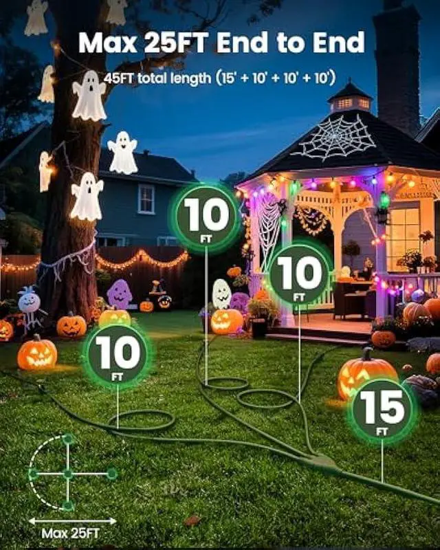 Multiple Outlets: Provides a 25 ft working length and a total length of 45 ft (15' + 10' + 10' + 10'); designed for managing large yard displays and powering multiple locations simultaneously; ideal for outdoor extension cord needs including holiday decorations and landscape lighting
