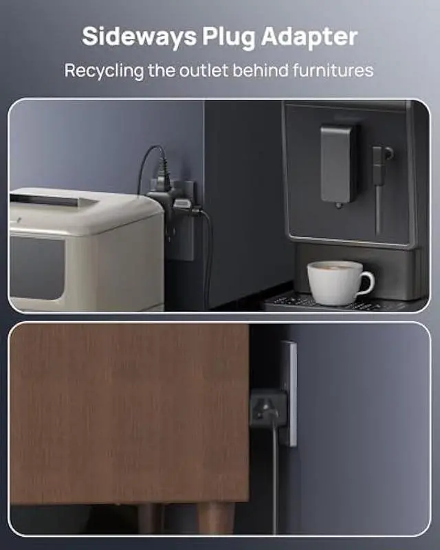 Sideways Outlet Extender: The plug spliter like as a tiny cube features with AC sockets positioned on three sideways which is perfect to use behind furnitures. And it is designed to accommodate devices with large chargers or irregularly shaped plugs, without any obstructions or interference