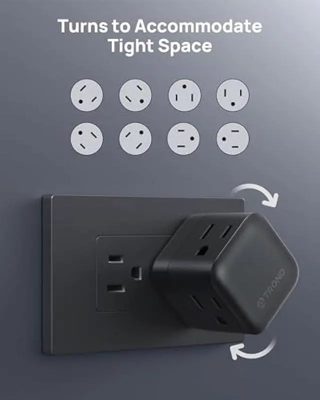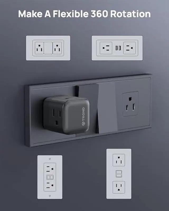 360° Rotating Plug: Featuring a 360° rotating plug, this multi plug wall outlet easily turn to match different orientation receptacles and easily fits into tight spaces behind furniture. And it can adjust both horizontal receptacle or inverted receptacles at will, make the receptacle to suit with the charger plug, which provides unparalleled flexibility and convenience