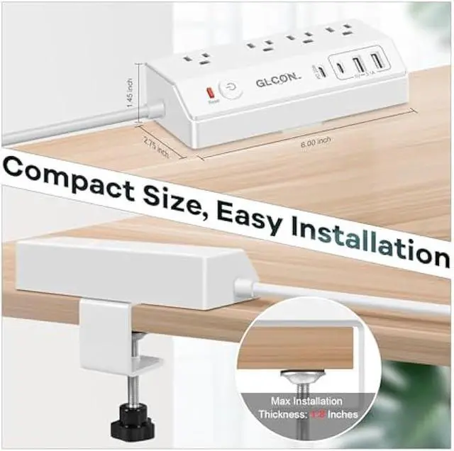 Multi-Purpose Use Surge Protector Power Strip - The clamp can support desk thickness up to 1.8 inches, work perfectly on the edge of the desk on your home, dorm, office or room. And the clamp is detachable and removable, you can take apart the clamp and use the power strip only if you dont need it, its portable and compact for wall mount, travel and business trip