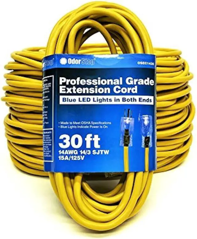 30 feet high visibility yellow, 14/3, 15 amp, SJTW Superior flexibility in cold weather, resistant to oil and grease LED lights in both ends, meets OSHA specifications UL listed Comes with limited lifetime manufacturers warranty