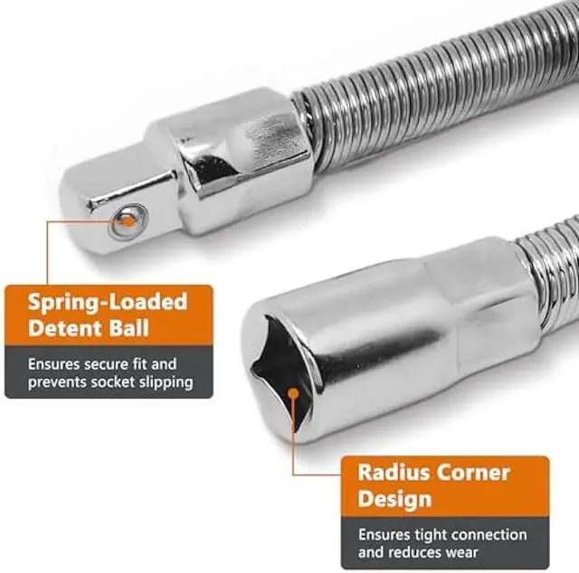 Features: These socket extensions add extra length and flexibility, giving you access to hard-to-reach nuts and bolts, perfect for loosening or tightening fasteners in tight spaces. In addition, the flexible sleeve extensions feature a flexible spring-loaded shaft that can bend into multiple positions and around obstacles or tight compartments, so you can apply torque from any angle to tackle jobs that rigid extensions can't solve