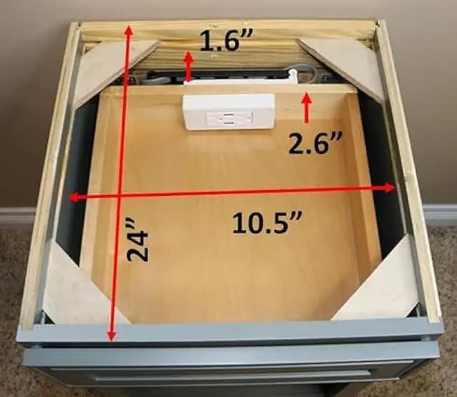 Minimum inside cabinet width: 10-1/2 (e. g., fits behind 8-5/8wide deep drawer in a framed cabinet)