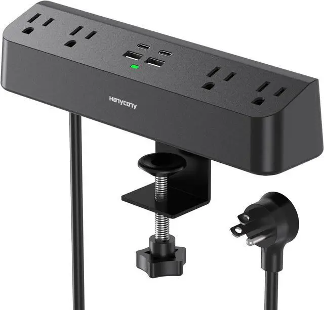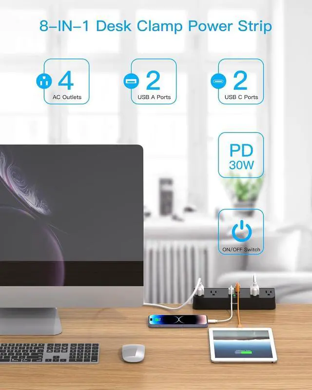 8-in-1 Desk Clamp Power Strip for Office & GamingThis space-saving desk clamp power strip turns one outlet into 4 AC sockets, 2 USB-A ports, and 2 USB-C ports (PD 30W fast charging). Ideal for small desks, standing desks, gaming desks, and workbenches. Perfect companion for your home office or college dorm room