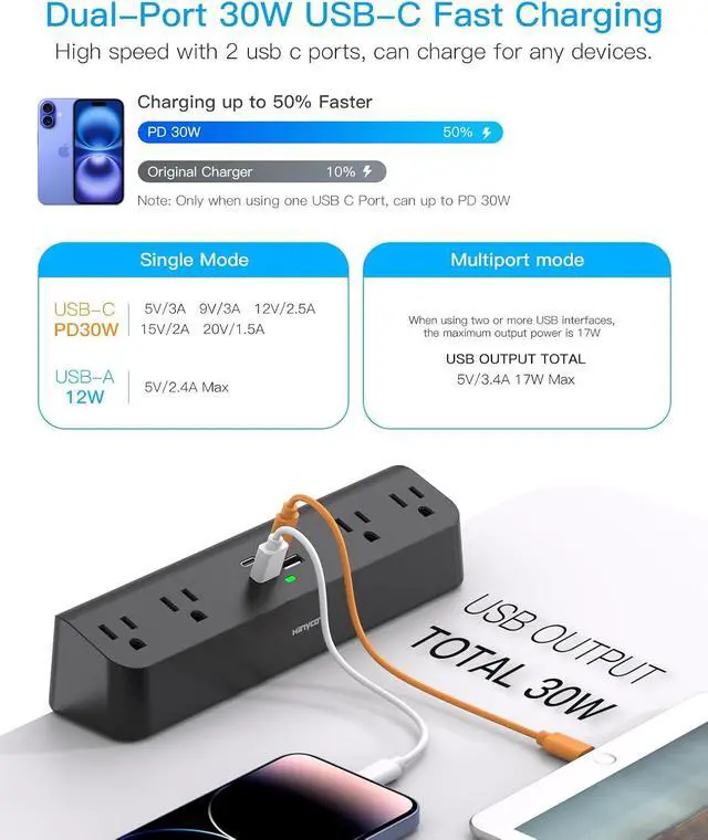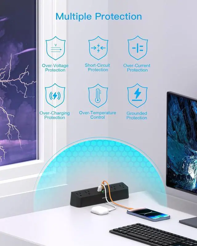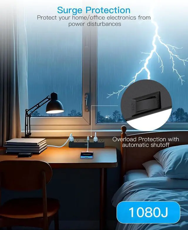 Multiple Safety ProtectionEquipped with 1080J surge protection, this power strip defends your devices against overloads, lightning, and voltage spikes. It also features overcurrent, over-voltage, overheat, and short-circuit protection. The on/off switch automatically cuts power in abnormal conditions, ensuring a safe and reliable charging environment