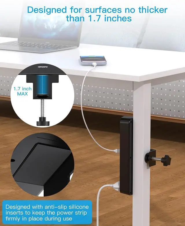 Clamp-On Design No Drilling RequiredEasily attaches to the edge of your desk (max thickness: 1.7 inches) with foam-padded clamps to avoid damage. Install in secondsno tools needed. The 5ft extension cord provides flexible placement for computer desks, large desks, or work-from-home setups