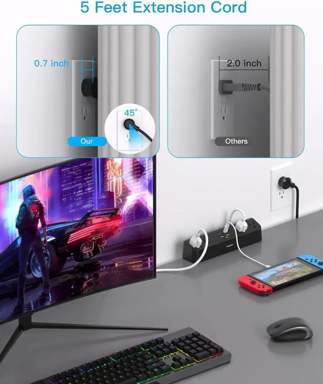 Wide-Spaced Outlets & Space-Saving DesignThe 4 AC outlets are widely spaced to accommodate bulky adapters without interference. Its compact profile and 45° flat plug make it easy to fit behind furniture or in tight spaces, helping to keep your workspace neat and organized. The angled design also creates extra room for lower wall sockets without blocking them
