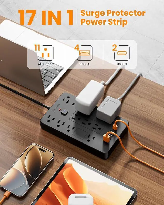 11 Outlets & 6 USB Ports -Bawmwim power strip surge protector features 11 AC outlets and 6 USB ports (including 2 USB C ports), providing ample space for all your devices. With a total output of 1850W/15A, perfect for home, office, or travel use