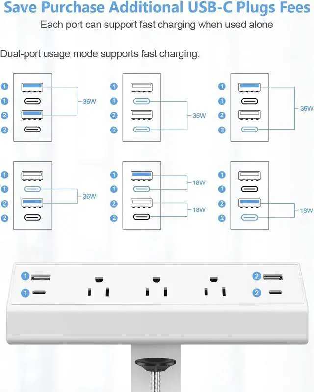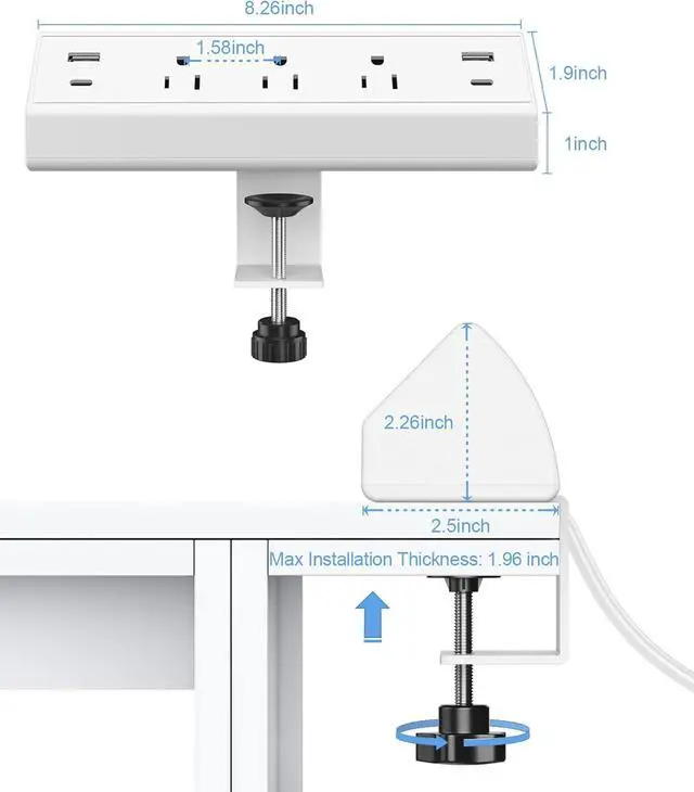 Desktop Power Strip with USB Ports: This edge mount power strip features a clamps to easily mount to desks, tabletops and more for secure desk organization and tidy workspace.