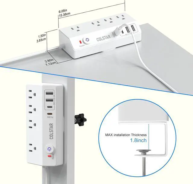 Clamp& Go- No Tools, No Damage InstallationThis desk clamp power strip designed for clean setups. The strong adjustable clamp securely attaches to desks up to 1.8 inches in seconds- no screws, drills, or adhesive residue. Your workbench stays pristine, and the desk power strip stays perfectly in place.