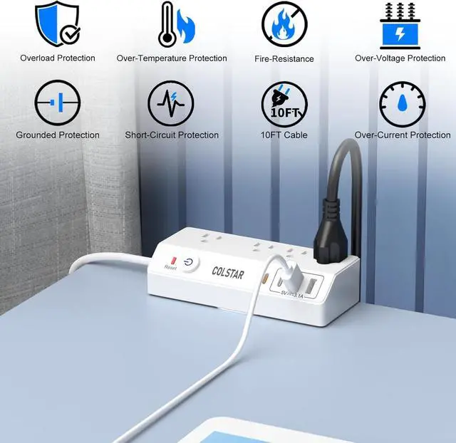 Safe& Reliable Power ProtectionThe desk clamp power strip features a built-in 1250J surge protector that effectively shields connected devices from voltage spikes. In the event of an overload, the resettable overload button automatically cuts off power to prevent equipment damage. Additionally, the premium flame-retardant ABS housing provides enhanced fire safety during daily use.