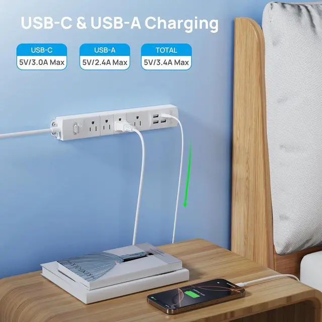 Power Strip with USB: This usb power strip has 3 USB A & 1 USB C charging port, eliminating the need for multiple ports for your phone, laptop, fire tablet & reader. Great for office, desktop, home, bedside, college dorm room, kitchen, etc. Deliver the faster charge speed up to USB A ports (5V/ 2.4A ) and USB C port (5V/3A) max for each port, ( 3.4A /17W in total).