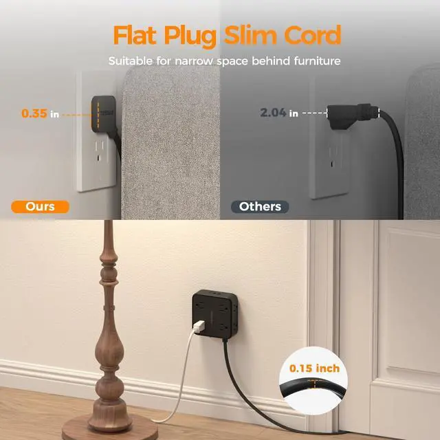 Extension Cord Flat Wall Plug: This flat plug power strip 5 ft easily reaches distant outlets without excess length on the floor; 0.15 inch thick flat cord fits through door gaps and under carpet; 45 degree right angle design doesn' t block the outlet below