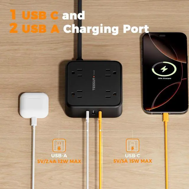 1 USB C and 2 USB A Ports: The multi plug wall outlet features 1 USB C (5V 3A, 15W Max), 2 USB A delivers 5V 2.4A, 12W Max per port, this plug extension outlet meets your various charging needs for phone, tablet and other devices