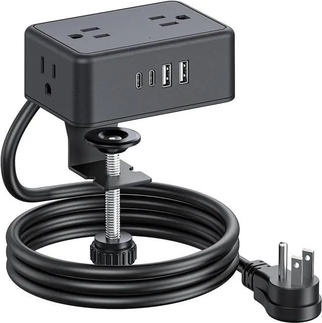 8-in-1 Desk Clamp Power Strip, This desk power strip with 4 AC outlets(12A/125V/60HZ/1500W) 2 USB A, and 2 USB C (20w); provides power for up to 8 devices at the same time. Come with a 6.6FT flat plug, easy-to-plug-in hard-to-reach outlets. a great addition to desk edge workspace.
