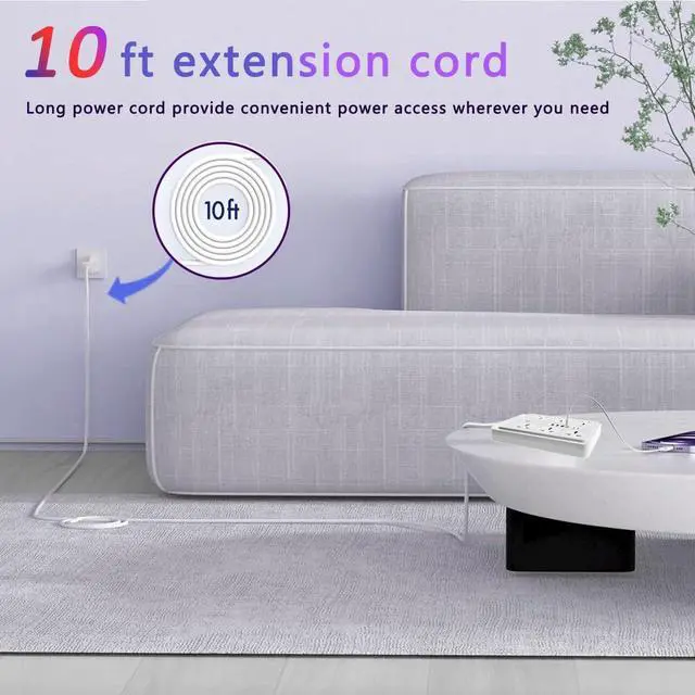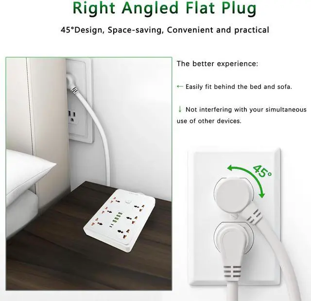 Space-saving & Flexible & Practical: 10ft Long power cord provide convenient power access wherever you need; Flat plug design can fit in tight spaces, easily fit behind the bed and sofa, 45 degree right-angle makes this flat plug does not obstruct other plugs, that allows you to use other devices simultaneously, which brings the better experience.