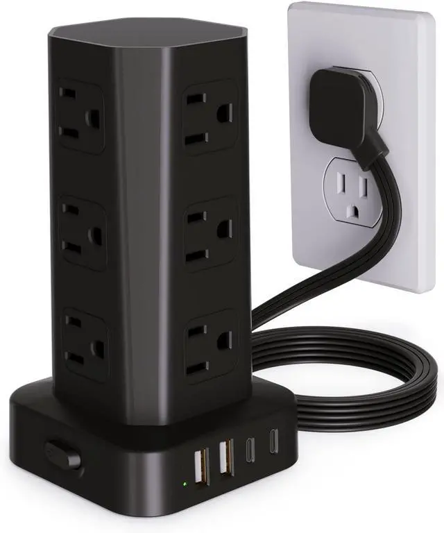 USB-C: This flat-plug surge protector power strip tower truns 1 socket into 12 wide-spaced AC outlets and 4 USB ports (2 USB-C). It powers up to 16 devices simultaneously with zero plug overlap and keeps your desktop neat. Great for home, office, dorm use