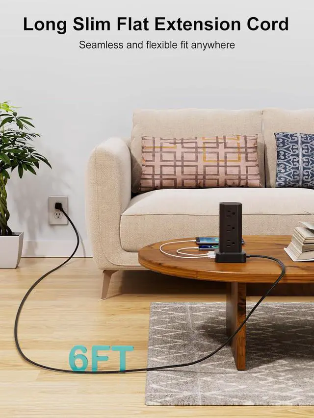 Flat Plug Extension Cord 6 Ft: This 6ft flat plug extension cord features a 0.35 -inch ultra-slim design that fits tight spots and hides behind furniture, sitting flush against walls. Its unique 45° right-angle plug prevents bottom-plug blocking. The 6ft long extension cord works perfectly for daily use in homes, offices, dorms, and college supplies