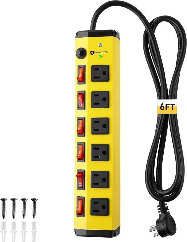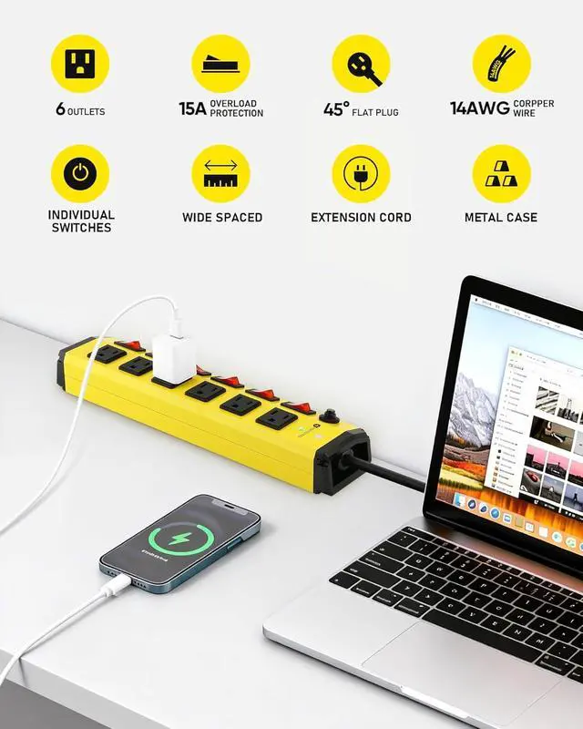 Surge Protector This metal power strip features advanced surge protection (1200 Joules) to safeguard your valuable electronics, tools, and appliances from voltage spikes, 14AWG extension cord with three-prong grounded plug. Ensuring long-term safety and reliability.