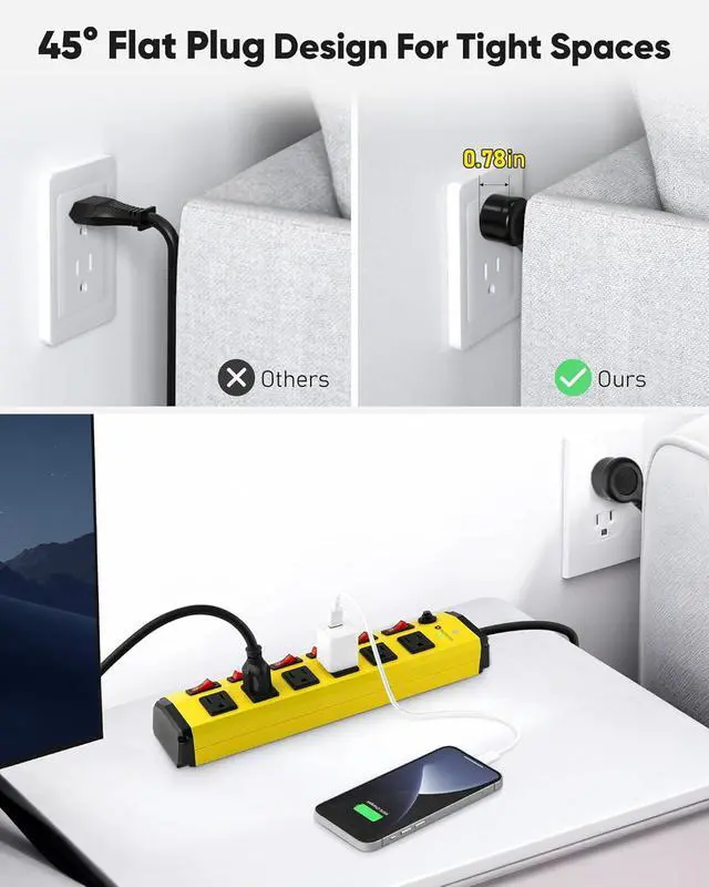 45° Flat Plug Design Designed for real-world use. The flat plug allows this heavy duty power strip to sit flush against the wall, flexible to plug into the wall socket and won' t take up too much spaces, preventing it from protruding and making it ideal for use behind furniture, in tight spaces, or on crowded workshop benches.